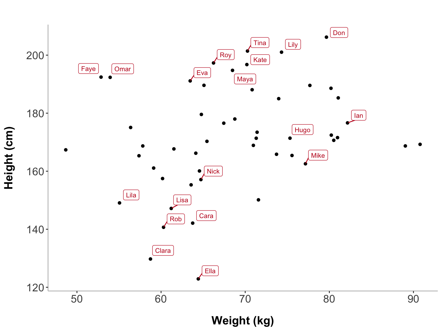 Now that we have tagged specific data points based on our conditions, we can visualize them. We will first show all participants who meet any of the tagging conditions - either they have a temperature above 38°C, a weight above 100 kg, or a height outside the normal range (below 150 cm or above 190 cm). We’ll create a scatter plot of weight vs. height and use ggrepel to label the participants who meet at least one of these conditions. ggrepel ensures that the labels do not overlap with the points, making the visualization clean and readable.