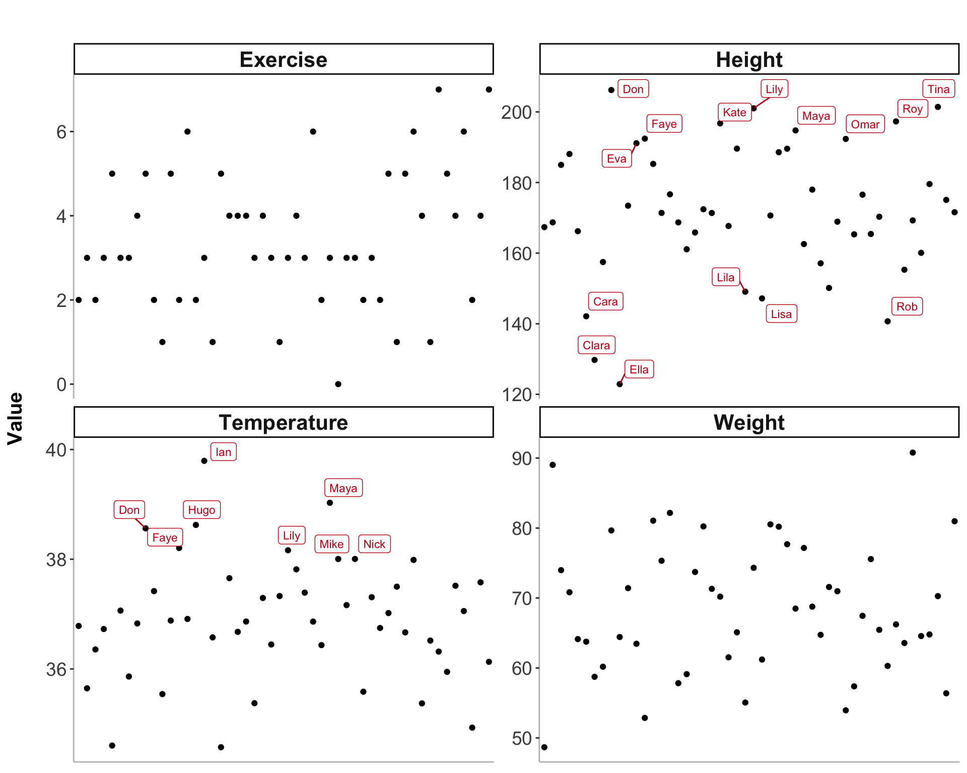 Next, we’ll create a faceted plot where each panel shows one of the three variables: temperature, weight, or height. Participants who meet the specific tagging criteria for that variable will be labeled in the plot. This is useful to examine the distribution of tags for each variable separately.